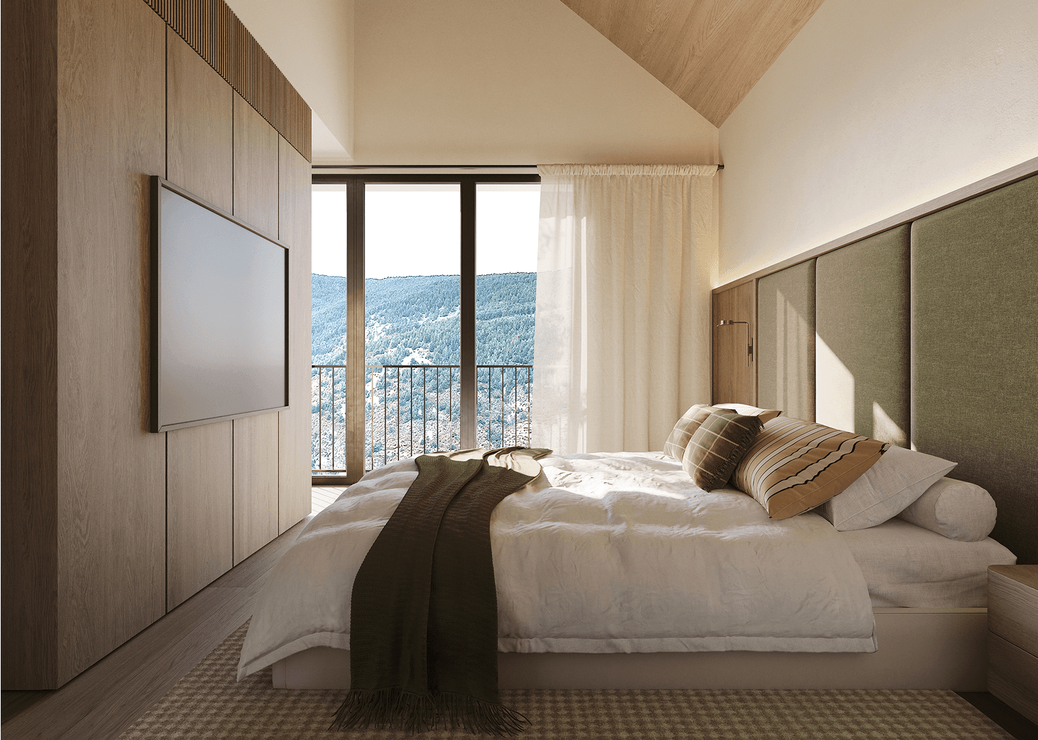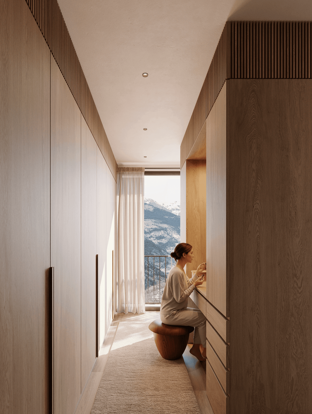 Aixecar la mirada cap on les copes danssen amb el cel. En el punt més elevat, l'espai es fon amb la llum. Fustes clares, sostres alts i finestrals que abracen la vall.