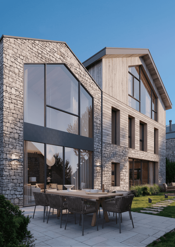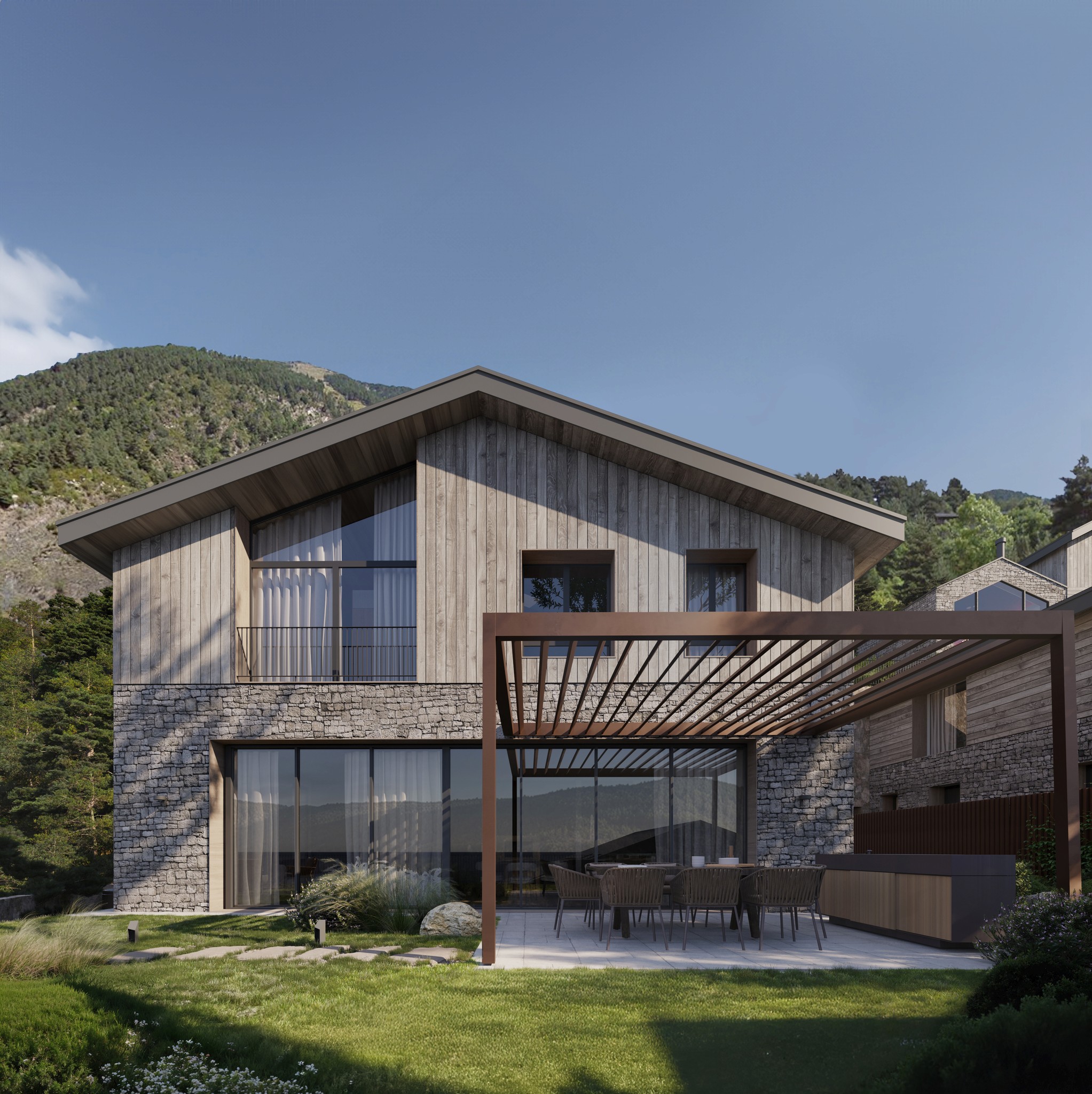 A Els Cortals, cada volum dialoga amb la pendent, amb la llum i amb la vegetació circumdant. El disseny garanteix privacitat i màxima llum natural, donant lloc a residències contemporànies que fusionen sofisticació i calidesa. Les façanes combinen pedra natural i fusta, mimetitzant-se amb l'entorn, mentre la distribució interior optimitza funcionalitat i confort.