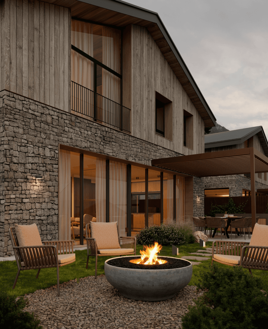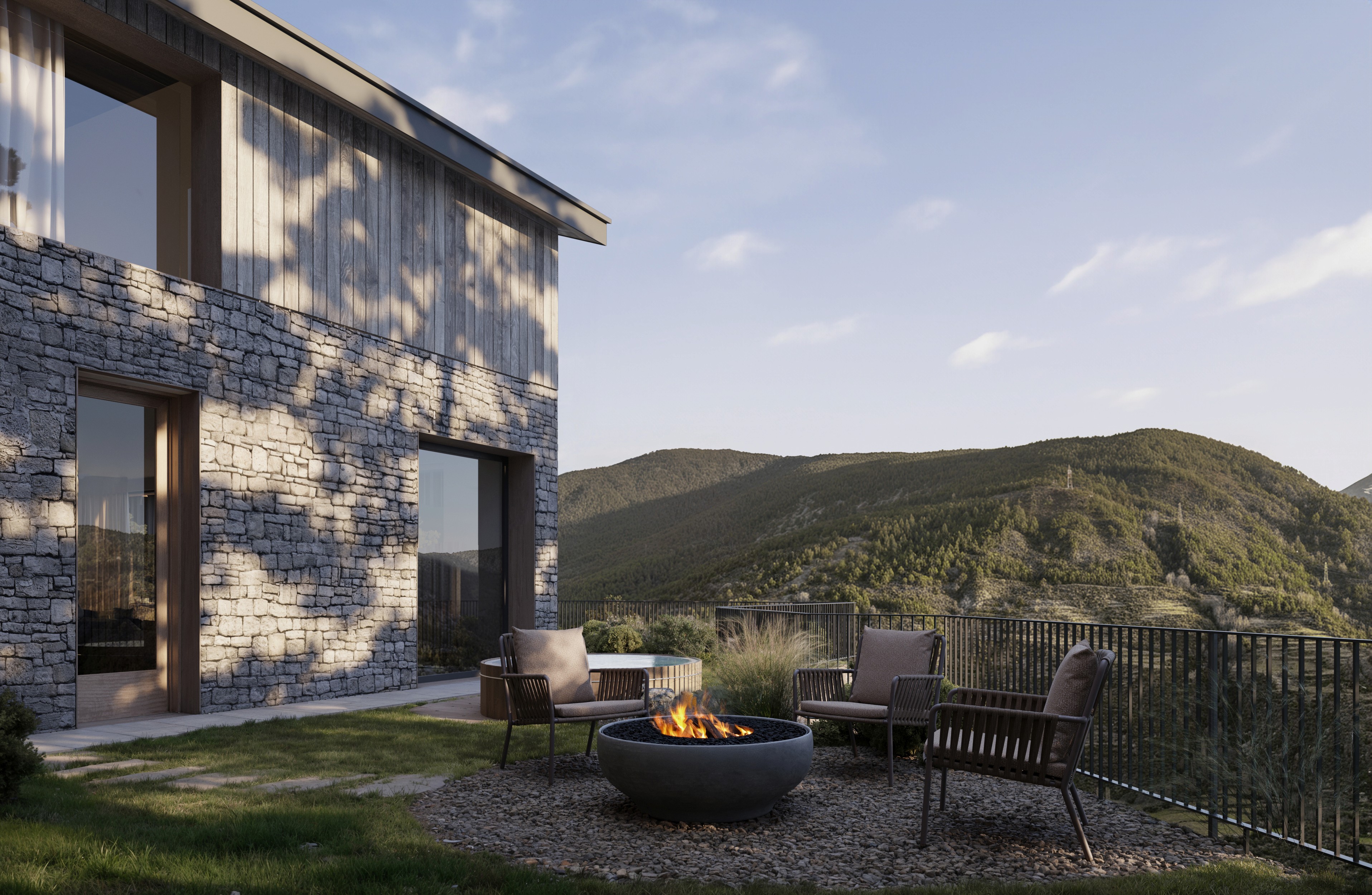 Entre 100 i 230m2, cada jardín integra césped, como opcional puede equiparse con cocina exterior y pérgola, o comedor al aire libre, zona de estar con chimenea de suelo (foc a terra) y hot tub, transformando el espacio exterior en una extensión habitable durante todo el año.