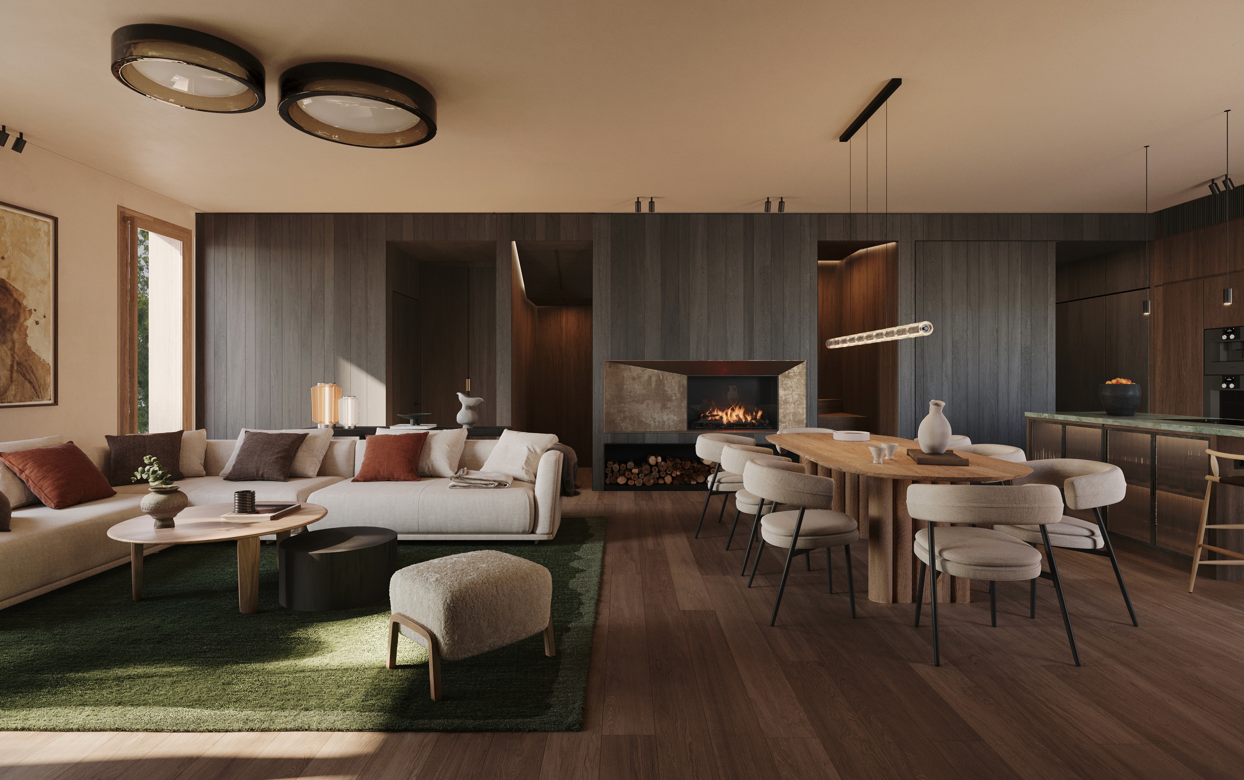 Aquell lloc on el bosc t'abraça, amb el cor de la residència. La cuina contemporània convida a compartir, mentre que el saló, amb la seva xemeneia de pedra i fustes de roure, irradia calidesa.